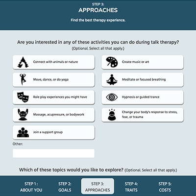 Built on years of research, our matching tool finds you licensed therapists who are best matched to your needs.